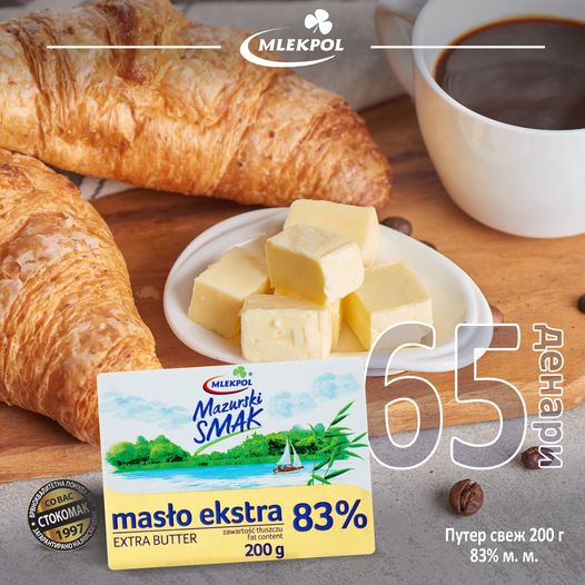 висококвалитетен свеж путер со 83% млечни масти, подготвен по традиционален рецепт и од внимателно селектирано 100% чисто млеко!