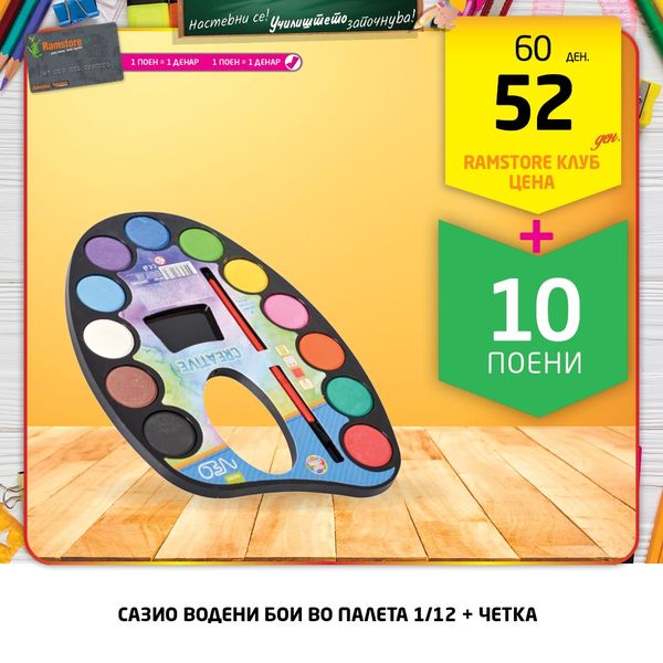 Водени бои во палета 1/12+четка по екстра цена од 52 денари + 10 поени + 14% попуст – само во Ramstore маркети!
