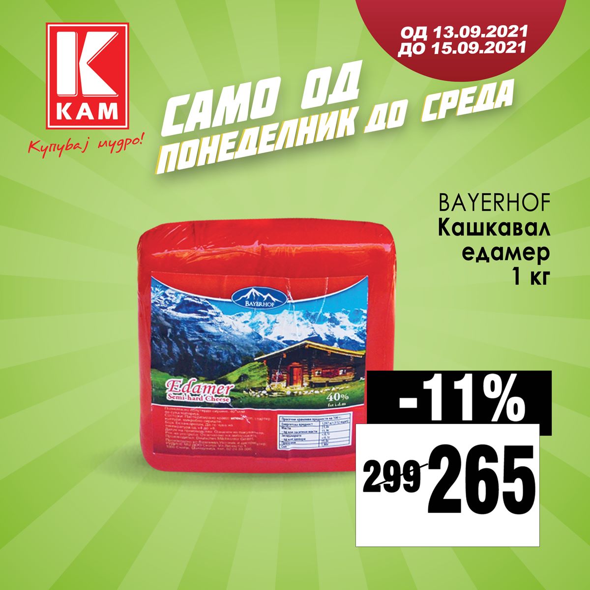 Екстра понуда на Bayerhof кашкавал едамер по супер цена од 265 денари и 11% попуст во КАМ маркети!