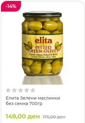Елита Зелени маслинки без семка 700gr на акција по одлична цена од 149 денари и 14% намаление на Пакет.мк!