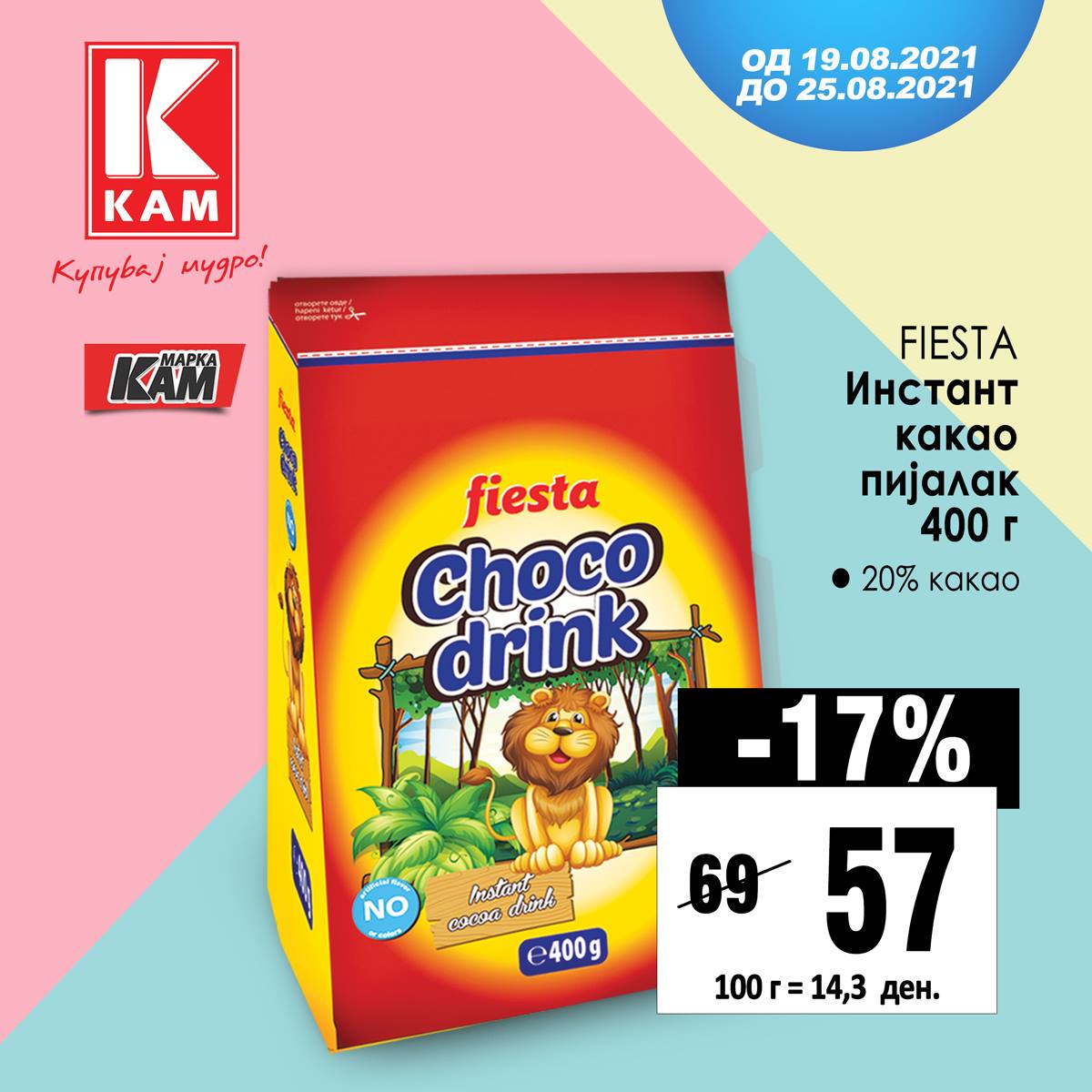 Инстант какао пијалак 400г Fiesta по одлична цена од 57 денари во КАМ маркетите!