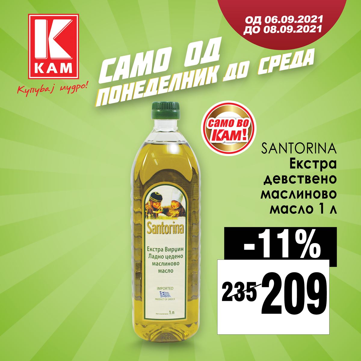 Екстра девствено маслиново масло Santorina со 11% попуст е екстра цена од 209 денари во КАМ маркети!