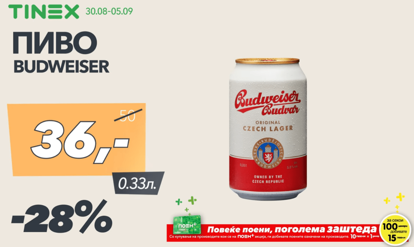 Пиво Budweiser по акциска цена од 36 денари и намаление од 28% само во Tinex маркети!