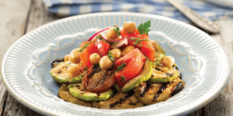4. Зачинете со половина од дресингот. Доматите се сечат на коцки. Кромидот се сече на половина. Магдоносот и копарот се сечат на големи парчиња. Во сад измешајте ги кромидот, доматите, магдоносот, копарот и однапред исцедениот наут. Зачинете со остатокот од дресингот. Зеленчукот се растура врз парчињата модар патлиџан и тиквички.