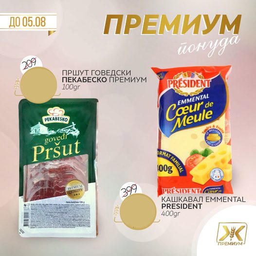 Премиум понуда до 5 август во Жито Маркети Кашкавал Emmental President 400гр, 319 ден. Пршут говедски премиум 100гр. Пекабеско, 155 ден....