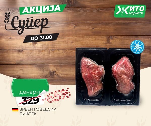 Супер акција до 31 август 65% акција на зреен говедски бифтек – цена од само 115 денари! Повелете во Жито Маркети