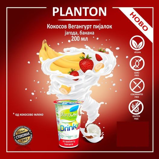 PLANTON Освежителен, безалкохолен кокосов вегангурт пијалок со јагода и банана. Совршена комбинација на 100% здрав напиток! -Ексклузивно во вашиот најблизок СТОКОМАК...