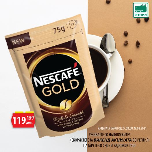 Уште само денес: Nescafe Gold 75g по одлична цена од 119 денари и намаление од 25% во Рептил маркети!