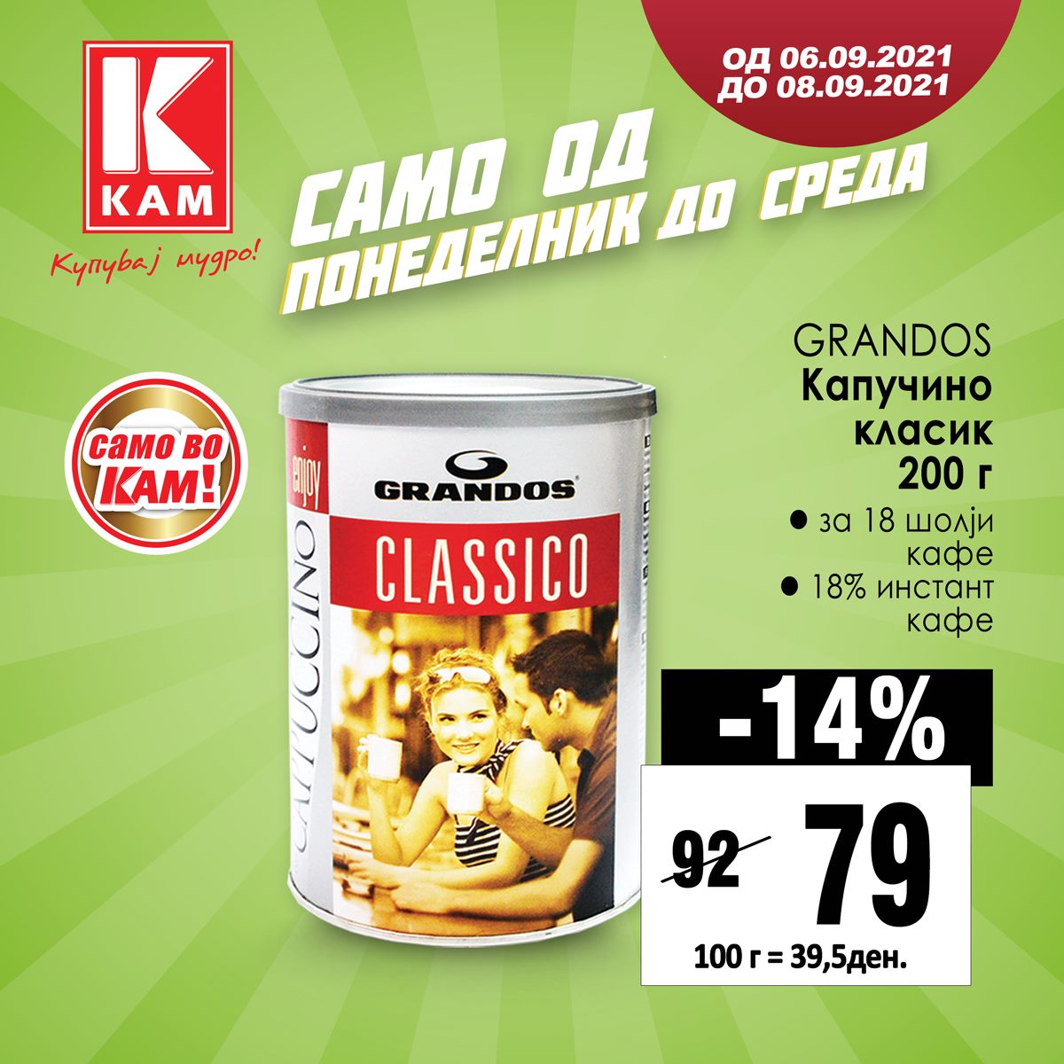 Капучино класик Grandos 200g по супер цена од 79 денари и намаление од 14% во КАМ маркети!