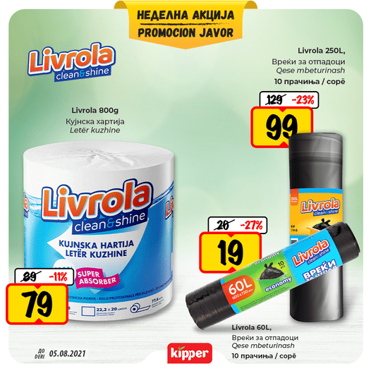 Кујнска хартија 800 г за само 79 денари, вреќи за отпадоци 250 л за 99 денари и вреќи за отпадоци 60 л 19 денари!
