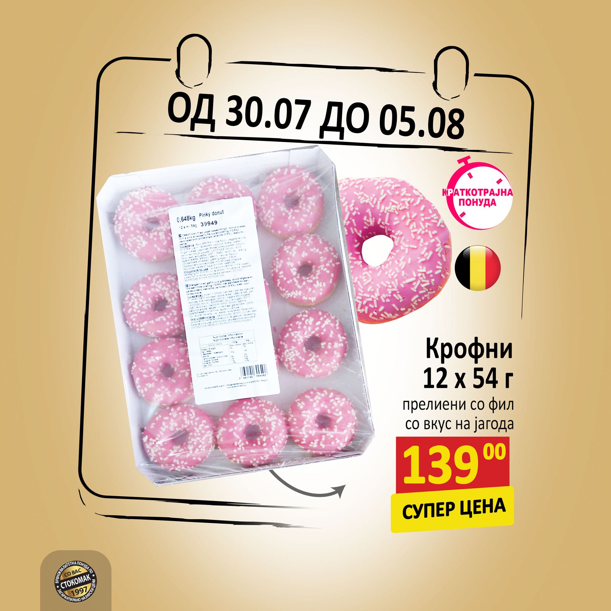 Крофни 12 x 54 г (прелиени со фил со вкус на јагода) по супер цена од само 139 денари!