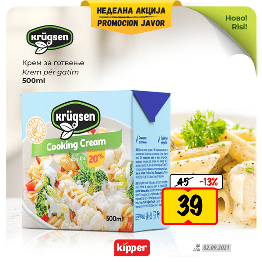 Крем за готвење Krugsen на акција по одлична цена и попуст од 13% само во Kipper маркети!