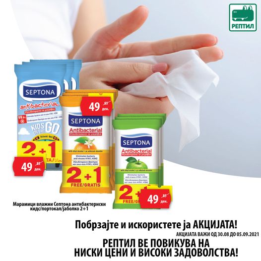 Влажни марамици за деца Septona 2+1 гратис по супер цена од само 49 денари и намаление од 43% во Рептил маркети!