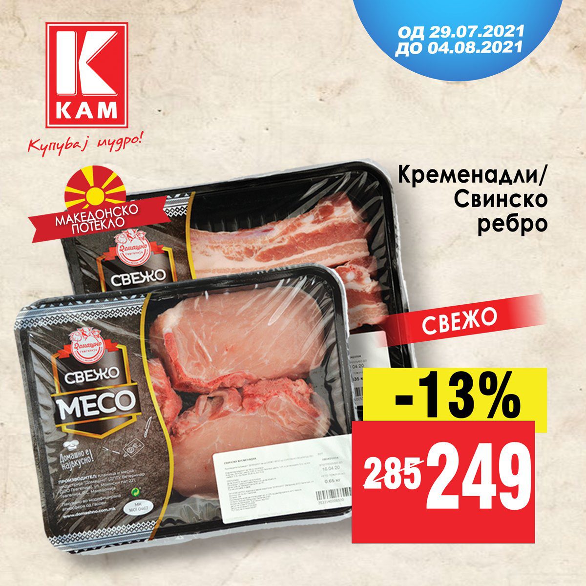 Свежи кременадли и свинско ребро по одлична цена од 249 денари и 13% попуст во КАМ маркети!