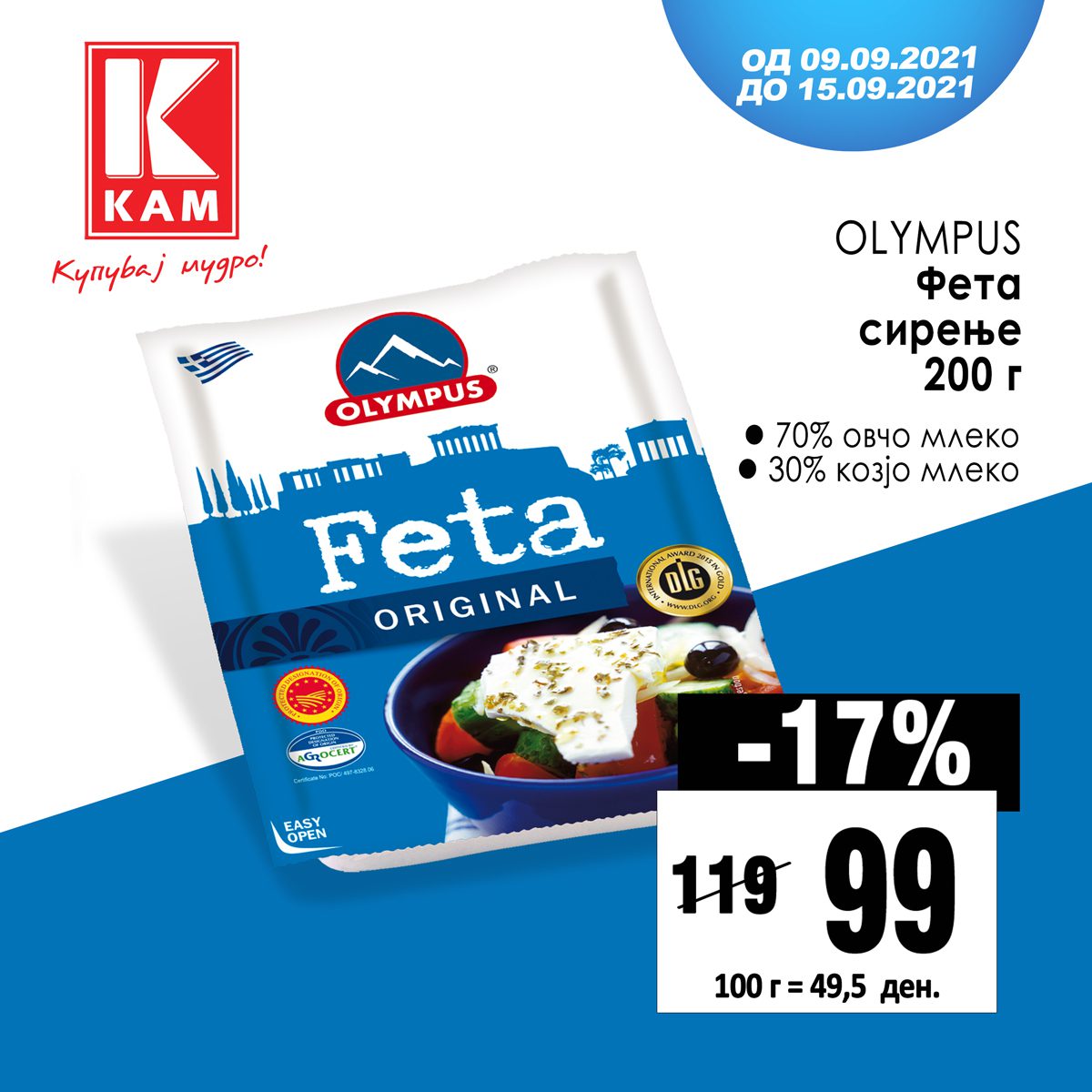 Olympus фета сирење по одлична цена од 99 денари и намаление од 17% во КАМ маркети!