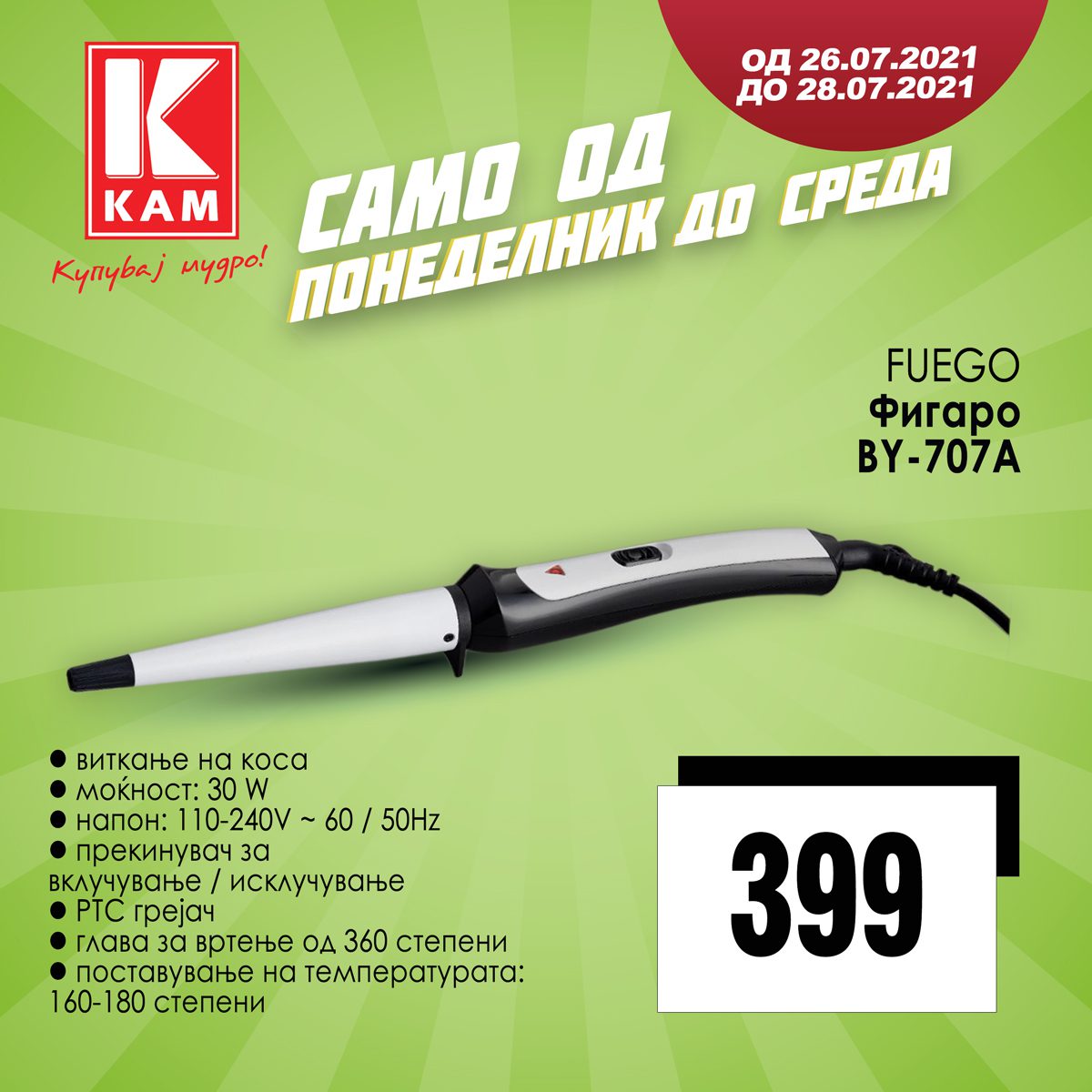 Fuego фигаро за виткање коса по одлична цена од 399 денари само во КАМ маркети!