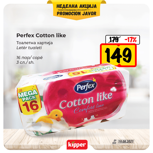Одлична понуда на најквалитетната тоалетна хартија “Perfex Cotton like”,100% целулоза, трослојна, 16 парчиња со намалена цена од 149 денари.