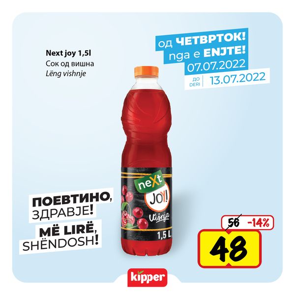 Сок од вишна Next Joy по намалена цена од 48 денари и 14% попуст во Kipper маркети !