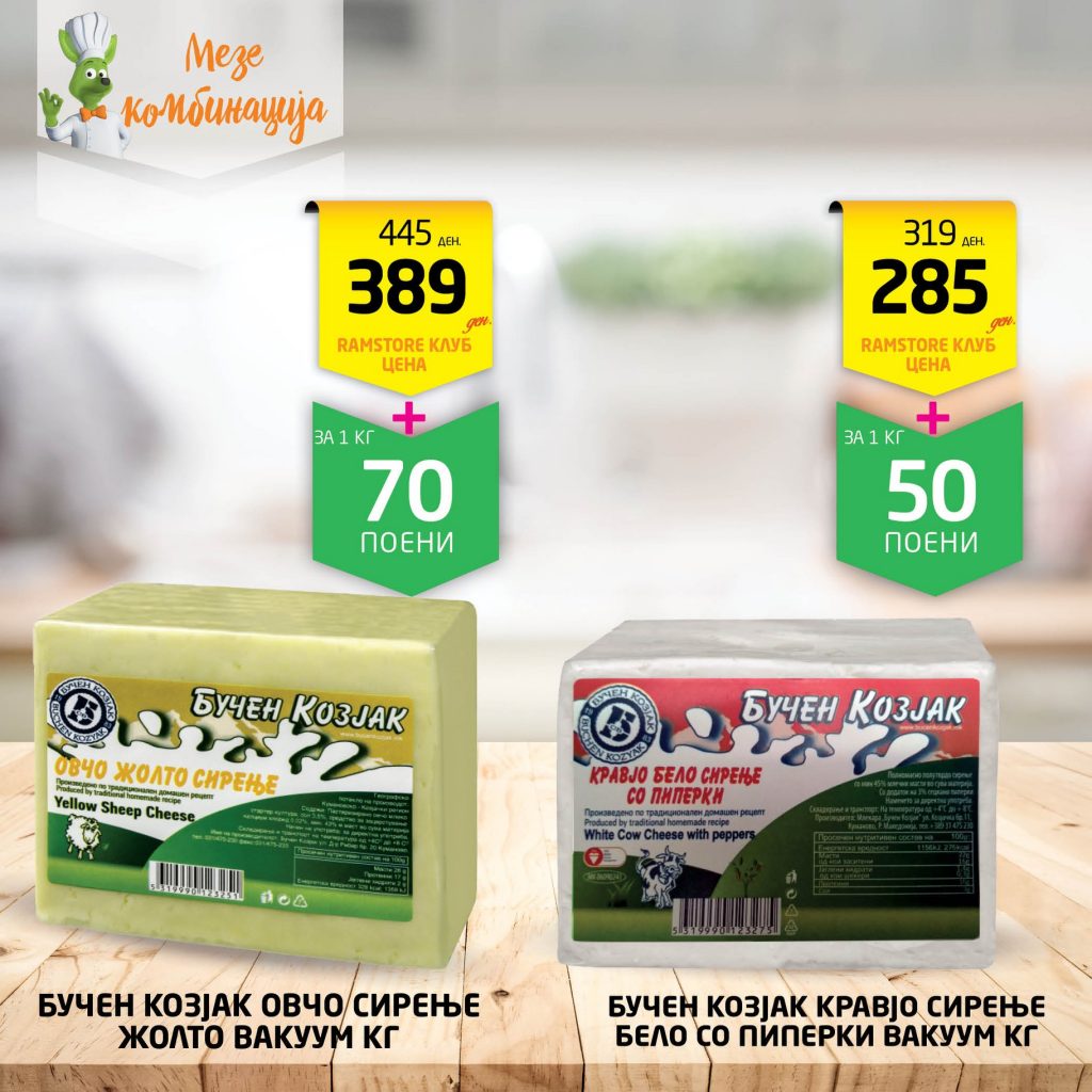 Мезе комбинација- Бучен козјак овчо сирење по промотивна цена од 389ден. за кг. и 70 поени и Бучен козјак кравјо сирење со пиперки по намалена цена од 285ден за кг. и 50 поени. Ве очекуваме! ![]()