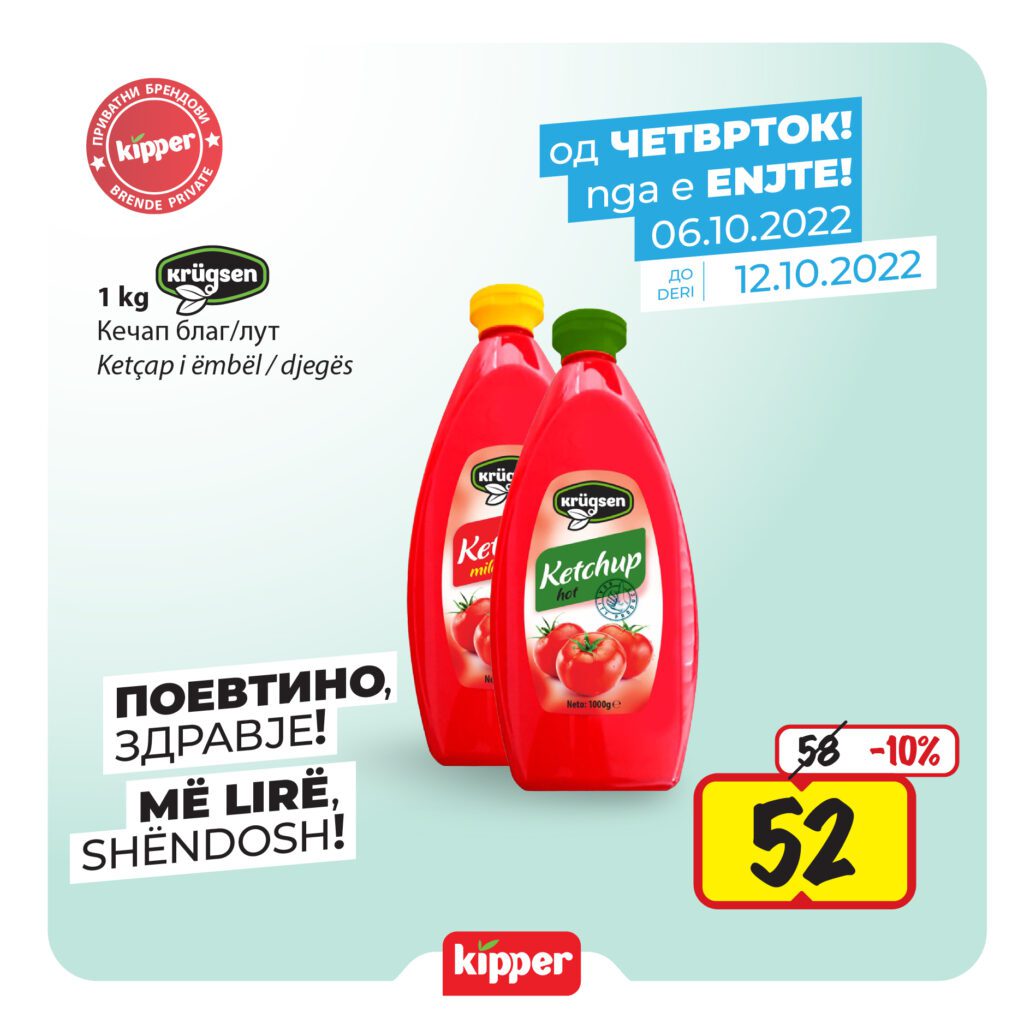 Акција на кечап Krugsen од 1kg по одлична цена од 52 денари и 10% попуст во Kipper маркети!
