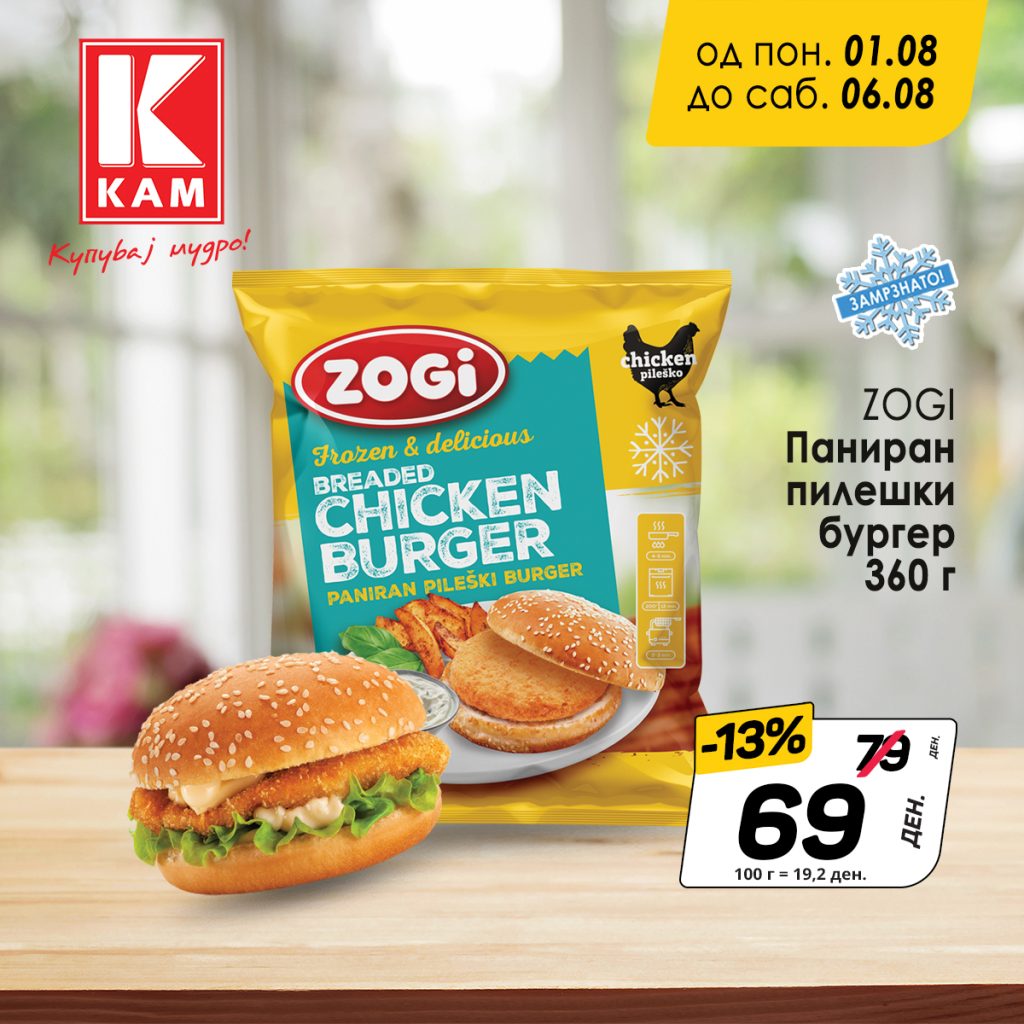 Акција на панирани пилешки бургер Zogi по екстра цена од 69 денари и 13% попуст во КАМ маркети!