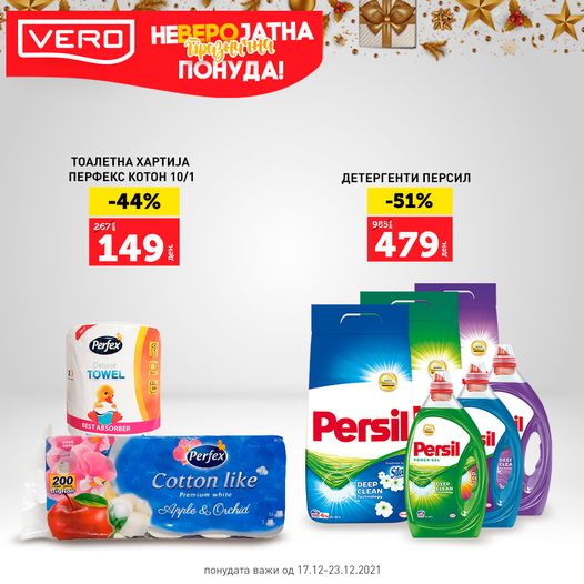 НеВЕРОјатно празнична понуда: Тоалетна хартија Perfex и детергенти Persil со попусти до 51% во VERO маркети