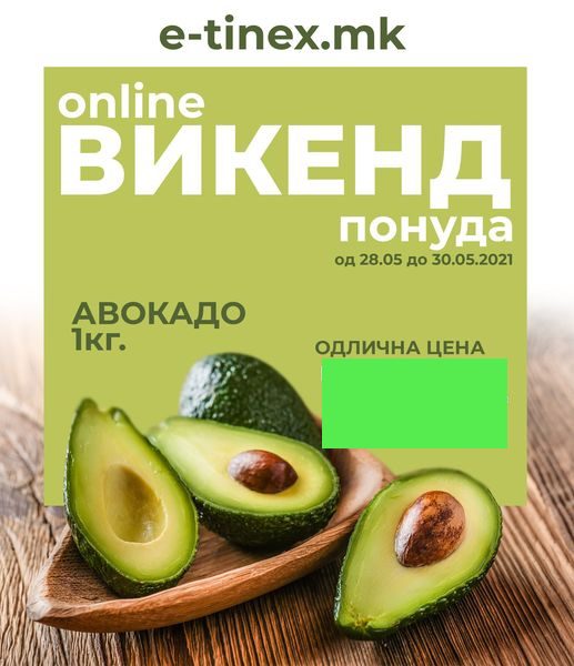 Најдобрата викенд акција! Нарачајте веднаш на www.e-tinex.mk Купете АВОКАДО 1кг. по цена од 189 ден. од 28.05 до 30.05.2021г. https://www.e-tinex.mk/default.aspx?e=600997