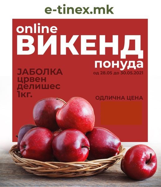 Најдобрата викенд акција! Нарачајте веднаш на www.e-tinex.mk Купете ЈАБОЛКА црвен делишес 1кг. по цена од 85 ден. од 28.05 до 30.05.2021г....