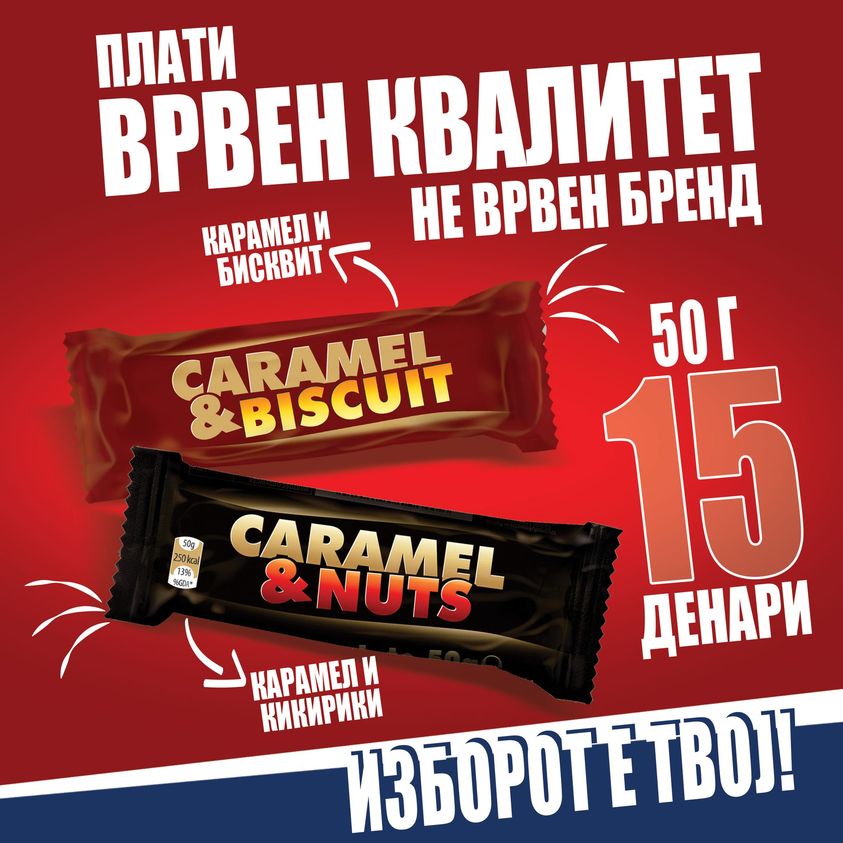 👉 Неодоливо вкусни чоколадни барови во комбинација со карамел и бисквит или карамел и кикирики по цена од 15 денари!