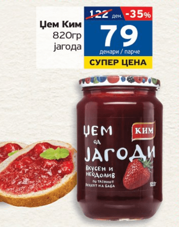 Одлична понуда на џем од јагода од Ким 820g по екстра цена од 79 денари и попуст од 35% во Кит-го маркети!
