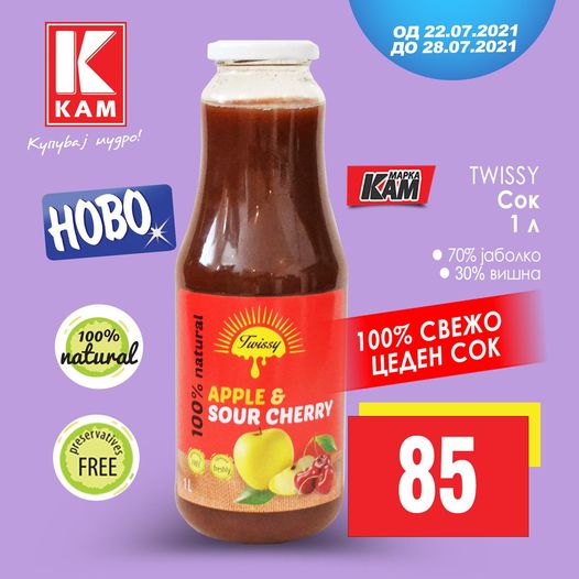 100% свежо цеден сок од јаболки и вишна по одлична цена од 85 денари во КАМ маркет!