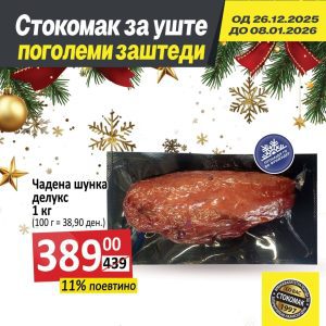 Чадена шунка делукс 1 кг по намалена цена во Стокомак – одличен избор за празничната трпеза и секојдневна употреба, со јасна заштеда по килограм.