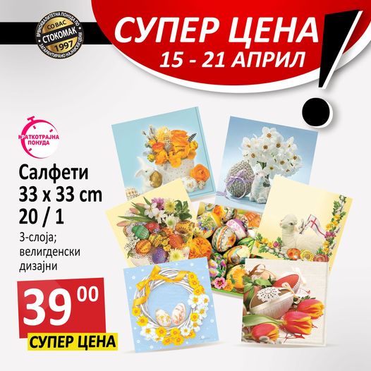 За претстојниот Велигден набавете салфети со велигденски мотиви, за повесела и разиграна Велигденска трпеза, по супер цена од 39 денари ![]()
