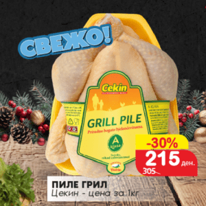 Свежо пиле грил Cekin по цена од 215 ден/кг, со 30% намалување во Кит-Го маркети. Идеален избор за печење, ручек или семејна трпеза, со проверен квалитет и одличен вкус.