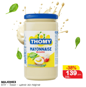 Thomy мајонез 611 г по намалена цена од 139 денари, со дури 38% заштеда.