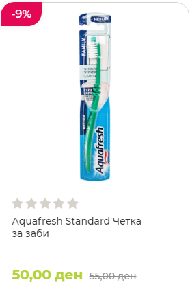 Акција на Aquafresh Standard четка за заби по одлична цена од 50 денари и попуст од 9% на Пакет.мк!