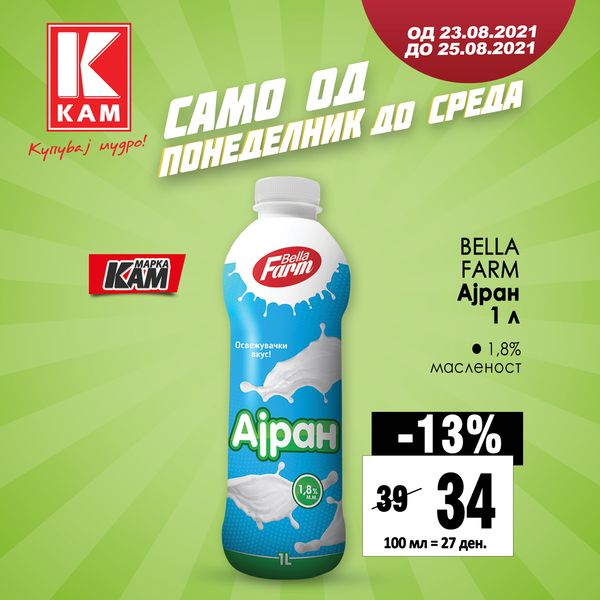 Ајран 1 L по одлична цена од 34 денари и намаление од 13% само во КАМ маркети!