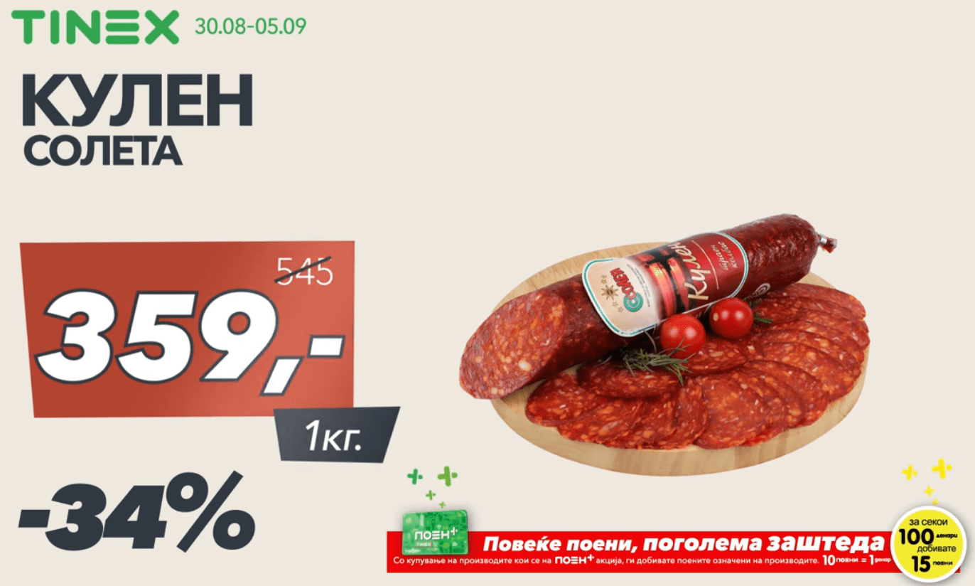 Кулен Солета по одлична цена од 359 денари за килограм и намаление од 34% во Tinex маркети!