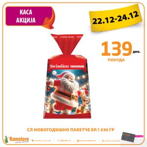Swisslion Takovo новогодишно пакетче 630 г е достапно по цена од 139 денари во Ramstore, што е практична и поволна опција за подарок или празнична радост за најмладите.