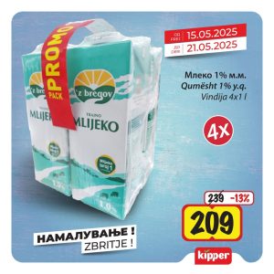 Vindija млеко 1% м.м. – 4×1л за 209 денари