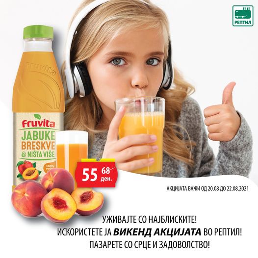 Викенд акција во Рептил маркети: Fruvita јаболко и праска 100% по одлична цена од 55 денари и 20% намаление!