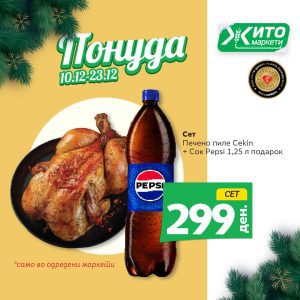 Сет со печено пиле Cekin и сок Pepsi 1,25 л е достапен по цена од 299 денари во Жито Маркети, што значи добивате комплетен оброк плус пијалак по значително поповолна цена.