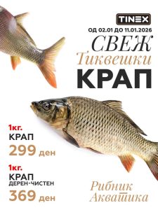 Свеж тиквешки крап по цена од 299 ден/кг во Tinex, а за оние што сакаат целосна подготвеност – крап деран и чистен за 369 ден/кг. Одлична понуда за љубителите на свежа риба и традиционални јадења.