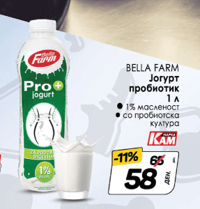 Акција на јогурт пробиотик Bella Farm по екстра цена од 58 денари и 11% попуст во КАМ маркети!